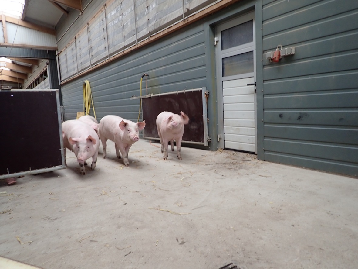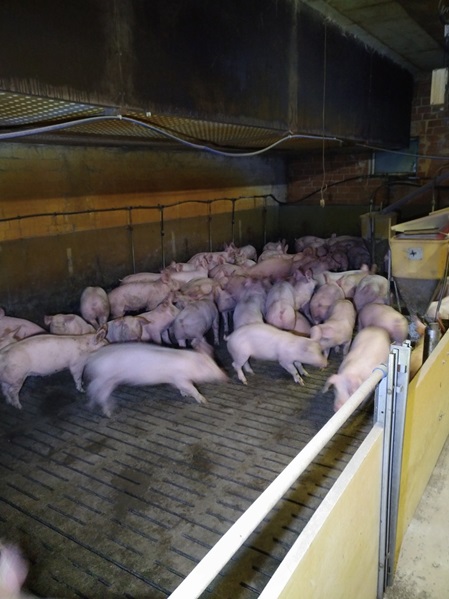 Die Schweine sind jetzt im neuen Stall. Dort sind es jetzt zwei Gruppen mit jeweils 350 Tieren. Es gibt 40 Fressplätze und viel Spielzeug. In dem Stall gibt es eine Waage, durch die die Schweine müssen, wenn sie zum fressen wollen. Noch sind die Waagen nicht aktiviert. Das passiert in ca. 5 Wochen. Die Schweine wiegen jetzt ca 60 kg. Geheizt wurde der Stall mit zwei Dieselheizern. Hier sind die Tiere jetzt für die nächsten ca 10 Wochen. Es folgen dann weitere Bilder in nächster Zeit.
