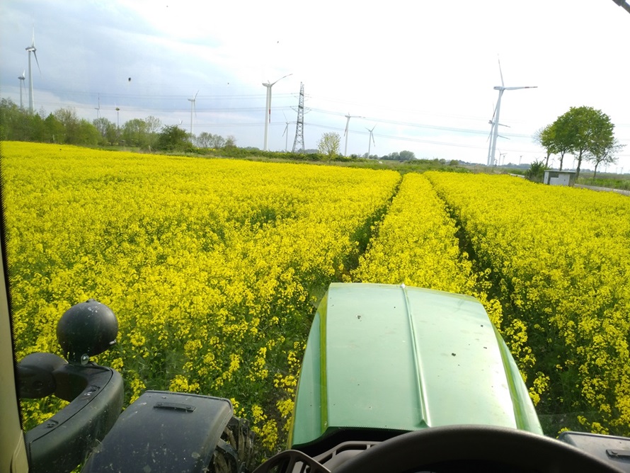 Dieses Jahr ist es relativ kalt. Der Raps blüht spät. Eine sogenannte Blütenbehandlung habe ich aufgrund des feuchten Wetters und der Marktlage am Donnerstagabend gemacht. Diese Spritzung schützt den Raps vor möglichen Pilzkrankheiten.